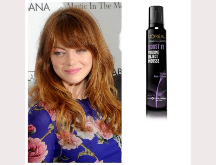 Το σγουρό μαλλί δε χρειάζεται να είναι περίπλοκο. Η Emma Stone, δίνει μια πιο glam πνοή στις μπούκλες της επιλέγοντας τον αφρό Advanced Hairstyle Boost It Volume Inject της L'Oreal Paris, πριν ξεκινήσει να τις φορμάρει.