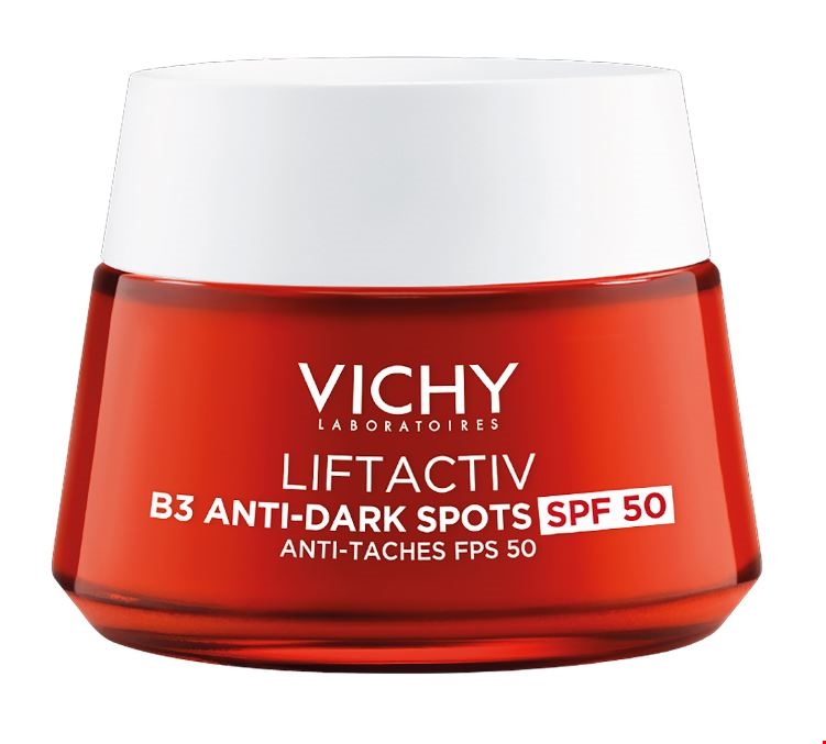 Νέα Liftactiv Β3 κρέμα με SPF50 κατά των κηλίδων, προηγμένη σύνθεση με Νιασιναμίδη (Βιταμίνη Β3) για αντιγηραντική δράση και LHA για απολέπιση σε συνδυασμό με προστασία ευρέος φάσματος SPF50 που προλαμβάνει και διορθώνει τις κηλίδες και μειώνει τις ρυτίδες.
