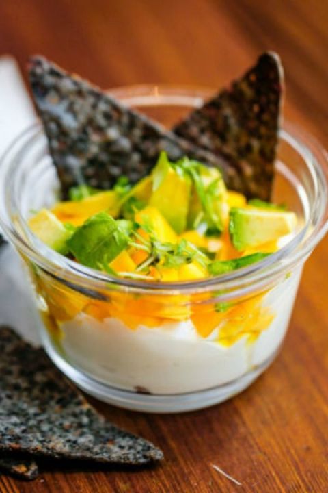 Σε ένα μπολμε γιαούρτι πρόσθεσε μισό μάνγκο, μισόαβοκάντο, λίγο ελαιόλαδο, αλάτι, κόλιανδροκαι τριμμένη καυτερή πιπεριά. Ολοκλήρωσετο σνακ με tortillas chips. Τοαποτέλεσμα θα σε ενθουσιάσει και θα σεγεμίσει με θρεπτικά συστατικά.