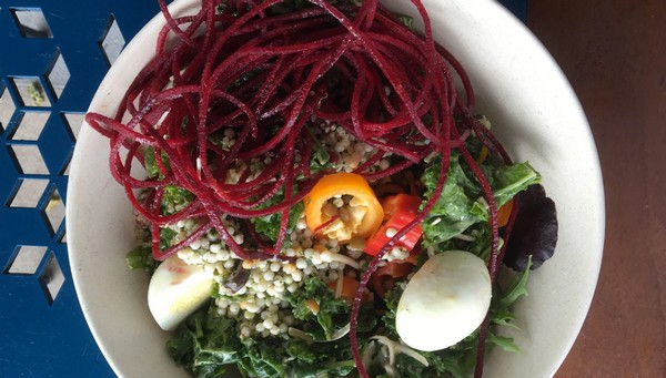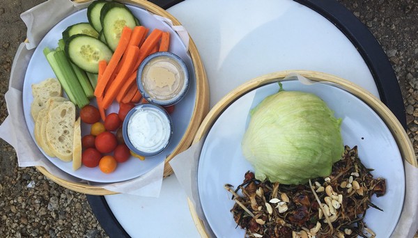 Για μεσημεριανό γεύμα, επιλέγει λαχανικά με χούμους και μαρούλι με κοτόπουλο, φιστίκια, μπαχαρικά και σάλτσα φιστικιού